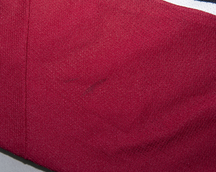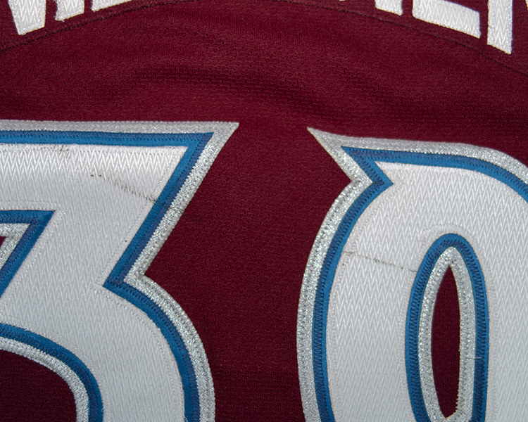 The jersey is from the set 4 playoff set, and contains the Avalanche set tag sewn in the rear hem. The cuffs show some alterations and possibly repairs on the seams. The 2001 All-Star patch is attached to the right chest. The jersey shows moderate game wear. Both sleeves sport a number of marks. There is a very nice black mark through the rear numbers. The crest sports a couple of smaller black marks. Both cuffs have been altered and show possible repairs. The jersey is accompanied by the Avalanche LOA and MGG documents.