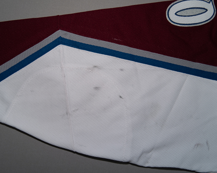 This jersey shows nice game wear, with small black marks throughout the shirt. Many of the marks are concentrated in the lower arms, with a couple of larger brush-type marks toward the front hem. The right elbow sports a small unrepaired slice. The numbers show some slight fraying around the edges. The jersey is accompanied by the MGG-NHL documents.