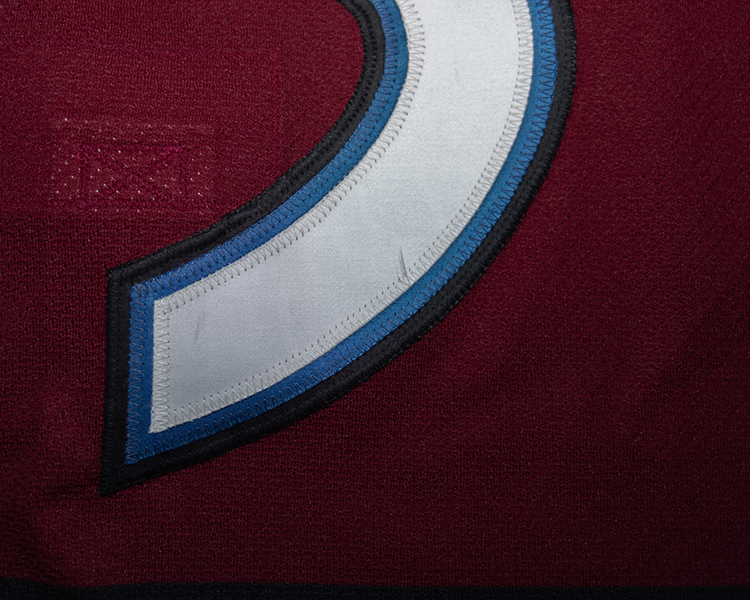 TThis alternate is from the first of two sets, and according to statistics, was worn five of the six games this set was used. The jersey shows predictably lighter wear, with marks in the sleeves, and a decent blue board scuff in the left elbow area. There are a few light marks in the rear numbers. Close examination under the light shows random marks throughout the burgundy portions of the shirt. The jersey is accompanied by the Avalanche LOA.