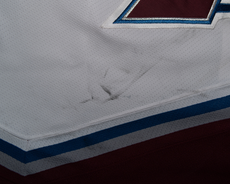 Good overall wear with a variety of marks throughout the shirt. The front body shows good multi-colored markes below the crest, with a couple of blue marks that provide a photo match. Both sleeves ahve good markings in the lower arms. The body has been turned under and sewn to shorten the jersey roughly one inch. The NHL shield shows upside-down on the inside, while the MHL-MGG tag is sewn in right-side up, after the alteration. Overall, a nicely worn shirt. Accompanied by NHL-MGG LOA.