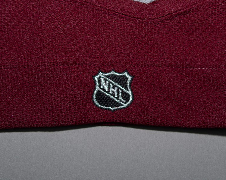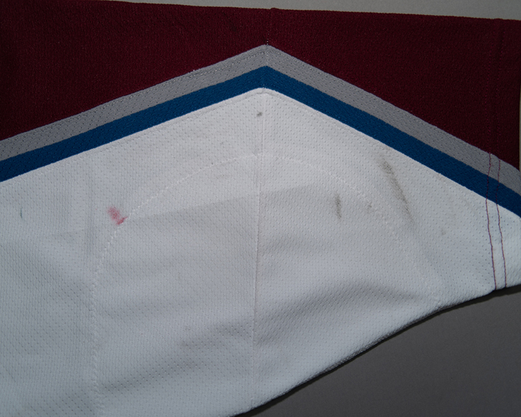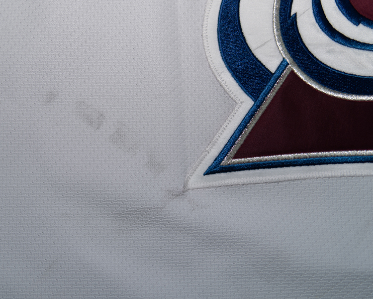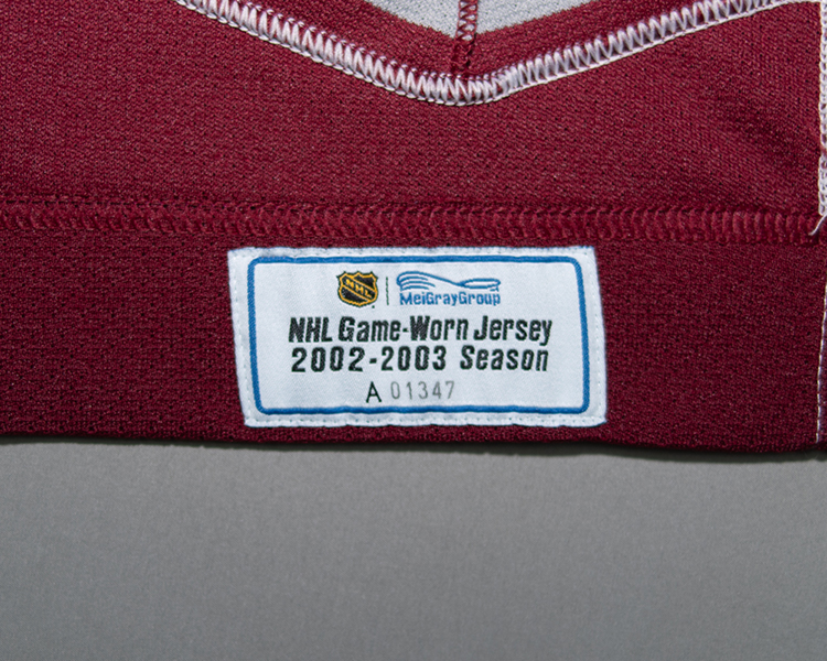 This jersey shows decent use for a preseason shirt. It has several large, light brush-type black marks on the front body near the bottom of the crest and one good black mark in the "A". The rear body shows a moderately dark stick mark down low, near the 1. Both sleeves show a number of black marks in the elbow areas, and the right sleeve shows a nice red paint transfer from either the boards or goal post. The crest and numbers show some evidence of laundering. The NHL-MGG tag is located in the rear hem, and the jersey is accompanied by the NHL-MGG documents.