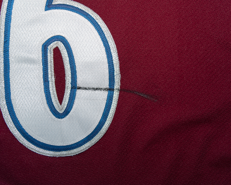 This jersey was worn in the first part of the 03-04 season, and is a true rookie jersey, as these were Liles first games in the NHL. The jersey shows lighter overall wear, however displays some decent black marks in the sleeves, especially the right sleeve, and one huge black mark across the rear "6". This mark is easily seen in game videos. The front of the jersey is pretty clean, with a light mark in the "A" of the crest, and a couple of white marks on the chest. The Meigray tag is sewn in the rear hem, and the jersey is accompanied by the NHL-MGG LOA.