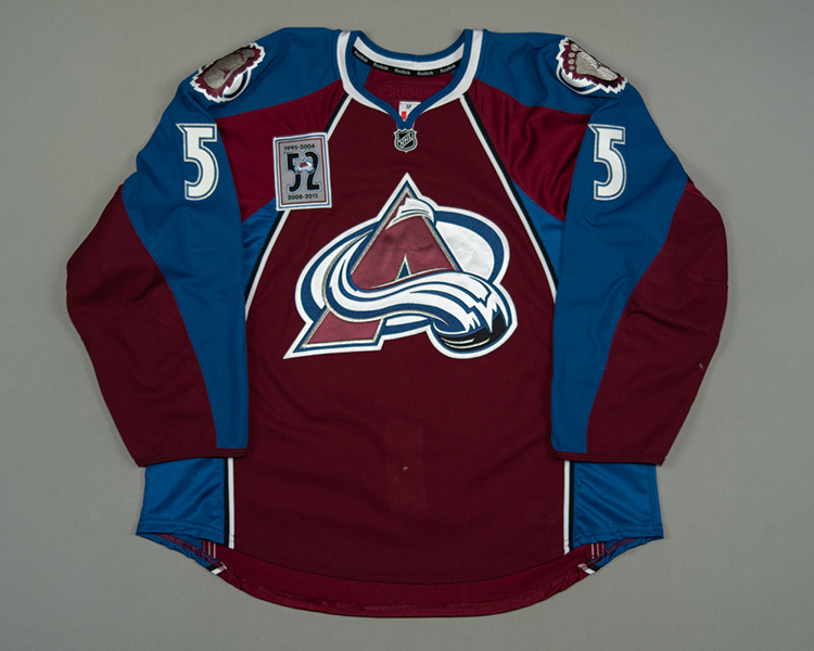 As part of a one-game set worn the night of Adam Foote's number retirement, the jersey shows very light wear with one mark visible on the lower sleeve. The jersey has the #52 Retirement patch sewn to the right chest. Acquired from a private collector.