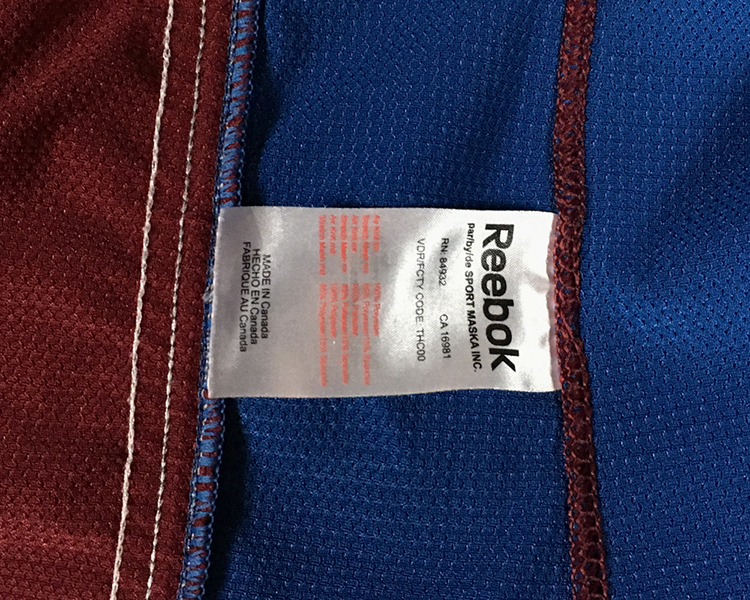 This jersey is from the first set of home jerseys from the Avalanche's 20th Anniversary season. The 20th Anniversary patch is sewn on the right chest, and the Colorado "C" logo (new this year) is on both shoulders. The jersey shows light wear overall, with some light burns and marks in the sleeves, and one repair on the lower sleeve. A nice souvenir from Alex Tanguay's final season with the Avalanche. The jersey is accompanied by the Avalanche COA.