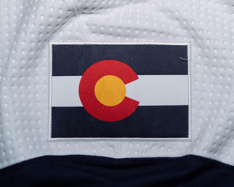 This set 1 alternate jersey was worn in eight games from November 7, 2018 to January 23, 2019 against Central Division opponents. It shows light wear against the dark blue fabric. The jersey is marked with a "1" in the collar designating the set. The game worn patch has been heat pressed inside the rear hem, with the registration number penned onto the patch. The jersey is accompanied by the Avalanche COA.