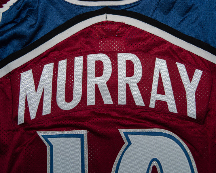 This jersey was acquired from the Colorado Avalanche during one of their late-season jersey auctions at McNichols Arena in May 1996. Although none of the first-year jerseys had a set mark, this jersey is believed to be from the second regular season set, due to the lighter wear, subtle differences in construction from the earlier shirts, and the timing of the auction. This particular jersey is notable because it is probably one of the few first-year, regular-cut jerseys that has no alterations, and is also from Murray's last NHL season. The jersey is easily identified as a first-year Avalanche jersey by its smaller crest, stylized letters, and blocked Starter logo on the hem. The jersey shows light game use, although the marks that are on it are quite prominent. The crest has some nice stick marks, and the back numbers have some decent marks, as well. The sleeves show some light wear, but overall the shirt is in good condition. A great reference piece. The jersey comes with the Avalanche notarized LOA that accompanied all of the auctioned jerseys.
