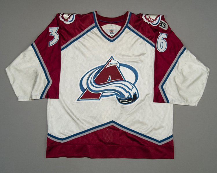 This jersey was acquired from Meigray, who originally acquired it from the Avalanche.The jersey shows decent wear with a few good marks. Has some nice stickwork on lower front. It exhibits significant pulling of the stitching along the upper piping, which is typical of a fighter's jersey. The jersey is marked second set, however the jersey was kept and fitted for the playoffs with the "CHS" Columbine High School memorial patch. The Avalanche LOA also states it was worn in the playoffs. The jersey also sports the extra wide sleeves that some players, especially the fighters, were wearing. This is the last year players would be allowed to play with custom alterations such as this. The jersey is accompanied by the Avalanche LOA and Meigray registration documents.