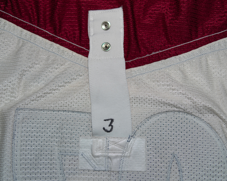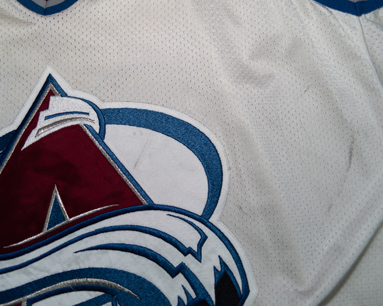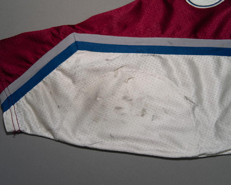 This jersey shows very good game wear. It is tagged set "3" on the fight strap, and is marked "I" in the collar. As with all 99-00's, it has the "NHL 2000" patch on the right chest. The jersey shows very good game wear, with numerous marks throughout the jerseys and several unrepaired tears and board burns in the arms. It has a very nice stick mark that cuts into one of the sleeve numbers. The jersey is accompanied by the Avalanche LOA and Meigray documentation.